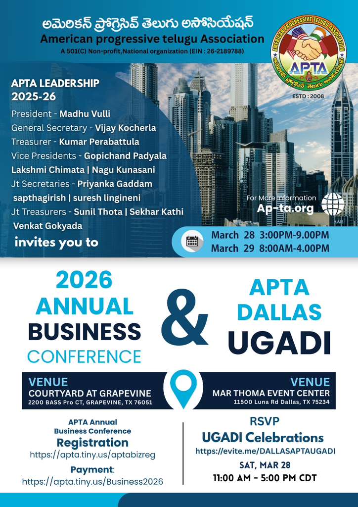 Date 28 Mar 2026 Time 8:00 am - 6:00 pm APTA Dallas- Ugadi Event Share this event + Add to Google Calendar + iCal export