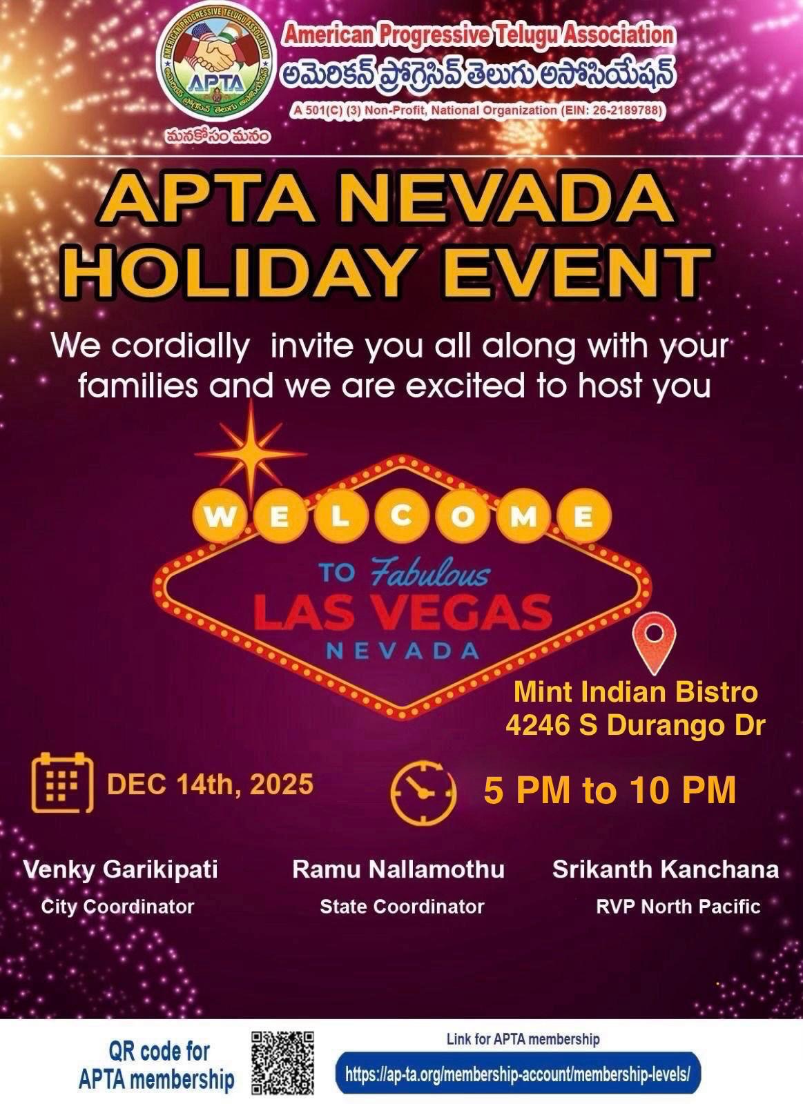 Dear Aptulu, Get ready for a day filled with togetherness, fun, and APTA spirit! You and your family are warmly invited to the *APTA Nevada Family Event 2025* – a wonderful occasion to get know and unite with our APTA families , meet APTA leadership, know about APTA flagship services , enjoy cultural programs, food, and plenty of memories together. 🗓️ Date: [Dec 14, 2025] 📍 Venue: Mint Bistro Banquet Hall at 4246 S Durango Dr, Las Vegas 89147⏰ Time: [5 PM to 10 PM] Let’s come together as one big family and make this gathering special! Please confirm your participation by filling out the RSVP form below 👇 🔗 RSVP here: https://forms.gle/rczfh6qnaBTom68TA Looking forward to seeing you all! – APTA Nevada Team