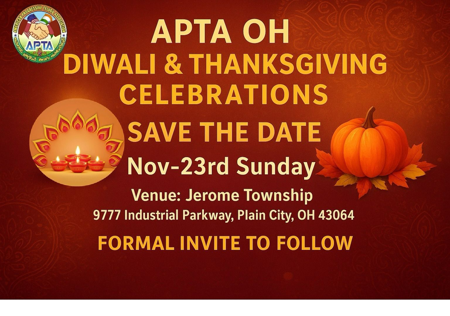 Date 23 Nov 2025 Time 6:00 pm - 8:00 pm APTA Ohio- Diwali & Thanksgiving Celebrations Share this event + Add to Google Calendar + iCal export