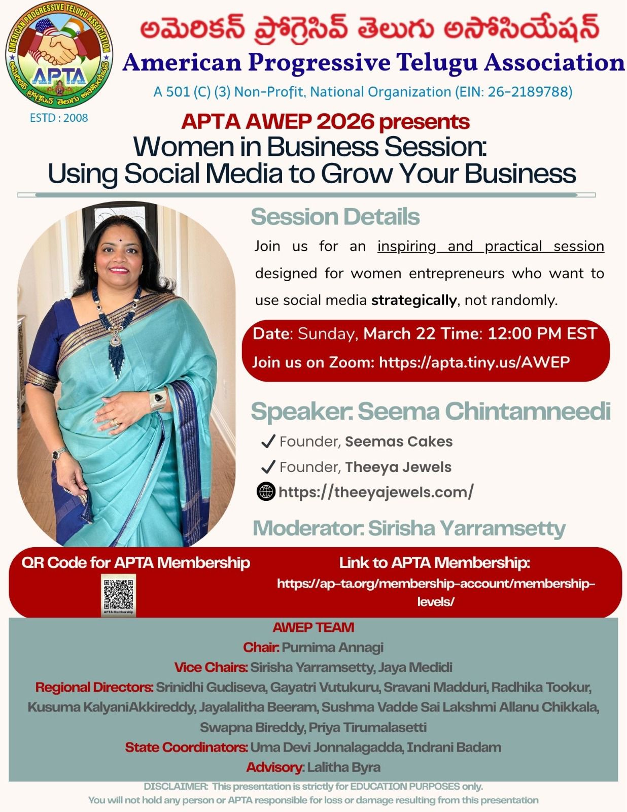 Date 22 Mar 2026 Time 12:00 pm - 1:00 pm AWEP- Women In Business: Using Social Media To Grow Business Share this event + Add to Google Calendar + iCal export